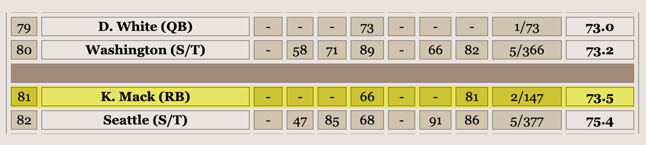 What this tells us is Kevin Mack CAN win, but he was placed in a very good situation (proven coach, elite receiver/playbook combination despite not having any routes himself) and an immensely strong defense. While he probably still shouldn’t be drafted before any running backs that are at all faster than him, in the right hands and right situation, he is not a total liability.